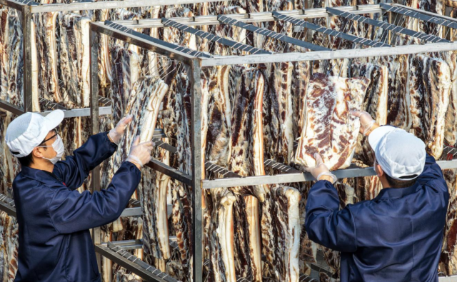 2026年1月8日,在安徽省黄山市黄山区全江生态农业科技有限公司的晒场上,工作人员正在晾晒徽州腊味 摄影 潘祯祥