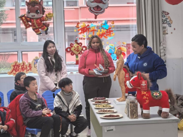 在中医药文化课堂上,来自马来西亚、印度尼西亚、葡萄牙等10个国家的留学生化身“洋中医”,通过趣味互动向小学生传授中医药知识。尼日利亚籍学生张青青以“药食同源”为切入点,指导孩子们通过视觉、触觉、嗅觉辨识枸杞、菊花等常见药材;印度尼西亚籍学生杨振宇现场演示合谷穴、足三里等保健穴位按摩,引得孩子们争相体验。“原来吃东西也能治病!”“我找到穴位了,按下去酸酸的!”教室里弥漫着草药清香,充满文化交融的温馨氛围。