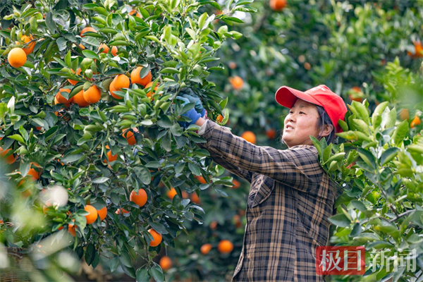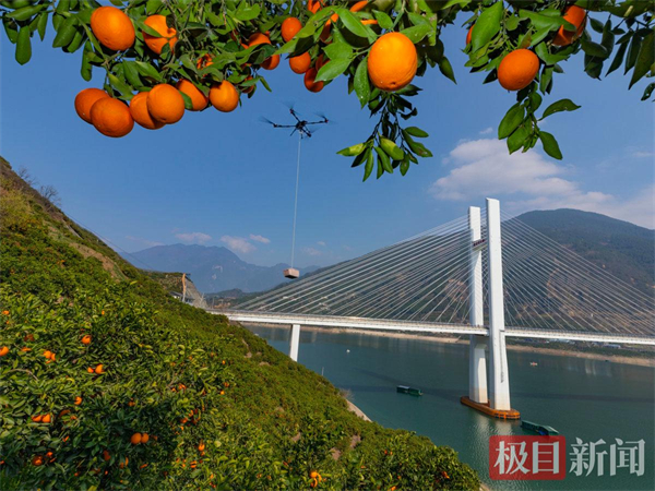 果园深处,橙农姜从山正忙得热火朝天。只见他一手托着橙子,一手握着果剪,手起剪落,三两下便摘下一颗饱满的果实。头顶上,一架无人机轰鸣作响,吊起满筐的红橙,翻山越岭运往山下的集散点。“今年红肉脐橙品质好、价格高,销路也畅通,每斤比去年涨了两毛钱,收入也比去年增加不少。”姜从山抹了把脸上的汗水,笑意从眼角蔓延开来。